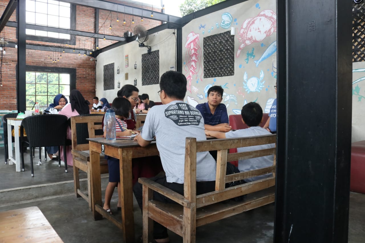 Konsep indoor tempat ini dengan bagian atap atas lapisan kaca yang terbuka dan terdapat bola lampu yang berjejeran.Saat masuk kalian akan melihat replika kepiting di dekat meja order.Suasana dinding yang memperlihatkan dekorasi bentuk batu bata,gambar seafood menambah suasana ini sangat cocok untuk dijadikan tempat berfoto lho….